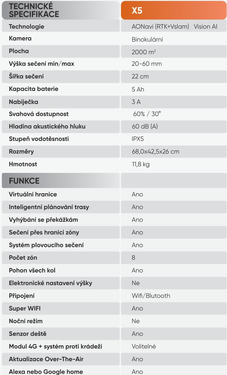 Sunseeker X5 je navržena tak, aby poskytovala perfektní péči o trávník pro středně velké trávníky do 2000 m². S navigací AONavi™ Navigation a Vision AI se snadno pohybuje kolem překážek a přizpůsobuje se složitým terénům.